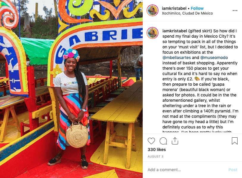 Kristabel est basée à Londres et lorsqu'elle voyage, elle trouve la beauté où qu’elle aille! Ses photos époustouflantes sont audacieuses, lumineuses et colorées, et avec ses voyages de Mexico à l'île Maurice, elle nous a définitivement inspirés à réserver notre prochaine aventure!