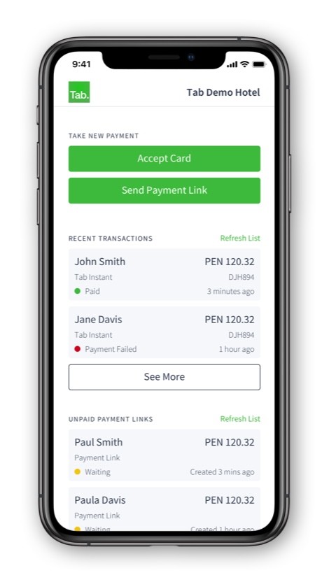 Tab, en revanche, est une plateforme complète de paiement et de réservation qui fonctionne en ligne, vous permettant de facturer les clients qui sont déjà arrivés sur votre propriété ou qui souhaitent payer à l'avance.
